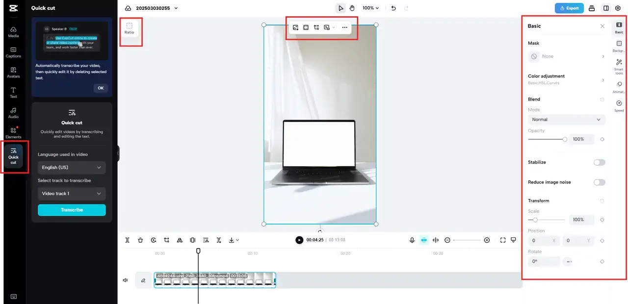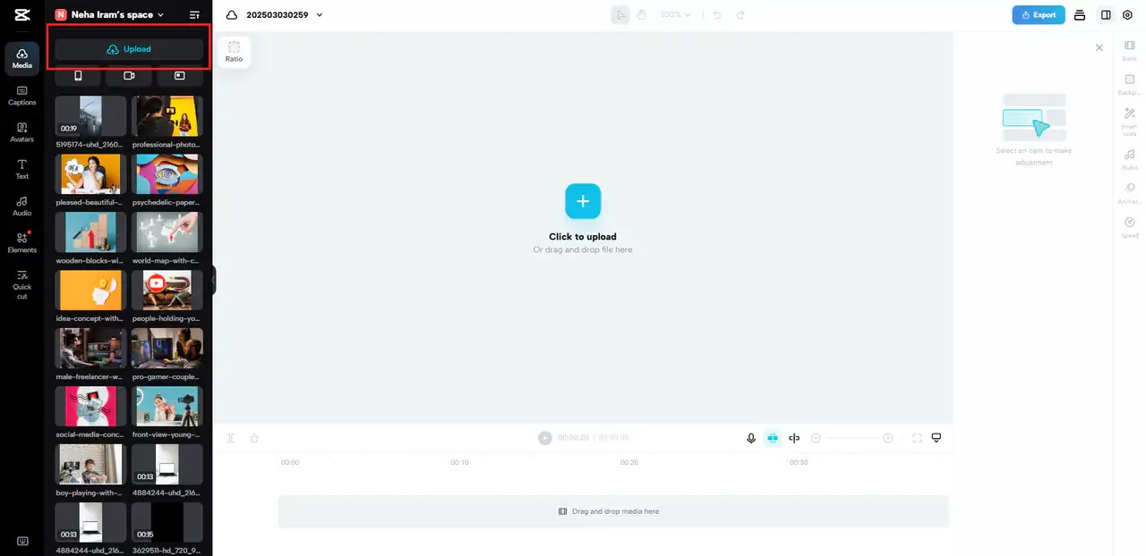 Start by uploading your video to CapCut Commerce Pro’s video editor. If you have a 4K or Full HD video, ensure you’re working with the highest resolution file to avoid unnecessary quality loss. Avoid converting or compressing the video before splitting.